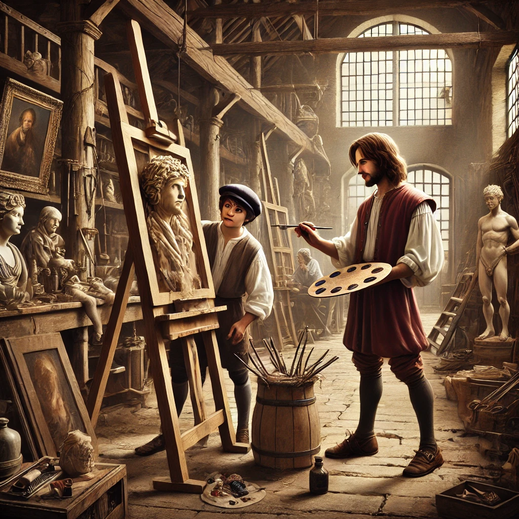 La formación artística de Leonardo comenzó en el taller de Andrea del Verrocchio, uno de los artistas más destacados de Florencia en aquella época. Bajo la tutela de Verrocchio, Leonardo aprendió las técnicas tradicionales de la pintura y la escultura, pero también adquirió habilidades en la ingeniería y la mecánica, dos campos que jugarían un papel crucial en su vida posterior. El taller de Verrocchio era un centro de creatividad, donde los artistas no solo pintaban, sino que también trabajaban en proyectos arquitectónicos y de diseño. Leonardo pronto comenzó a destacar por su talento inusual, y según la leyenda, Verrocchio dejó de pintar después de ver cómo su joven aprendiz había mejorado uno de sus cuadros.